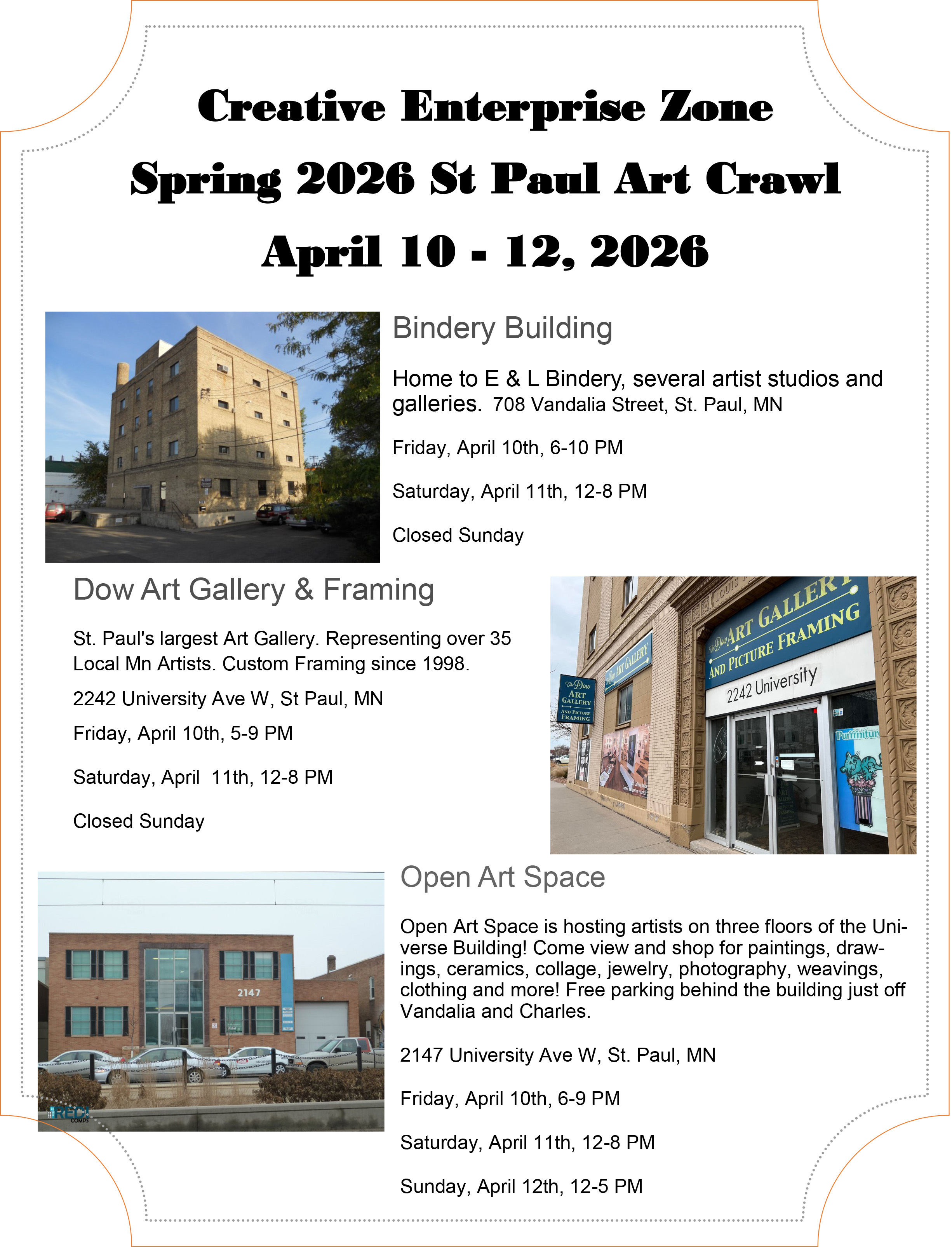 Come Visit the Largest Private Art Gallery in St. Paul!Over 3,600 sqft of Local Artists!Paintings, Sculpture & Photography The Spring 2026 St Paul Art Crawl.Friday, April 10 from 5-9, and Saturday, April 11 from 12-8.We are closed on Sunday. Coming in April – A Solo Show by Marcie Soderman Explore the many outdoor building murals in the Creative Enterprise Zone surrounding the Dow Gallery! Click here